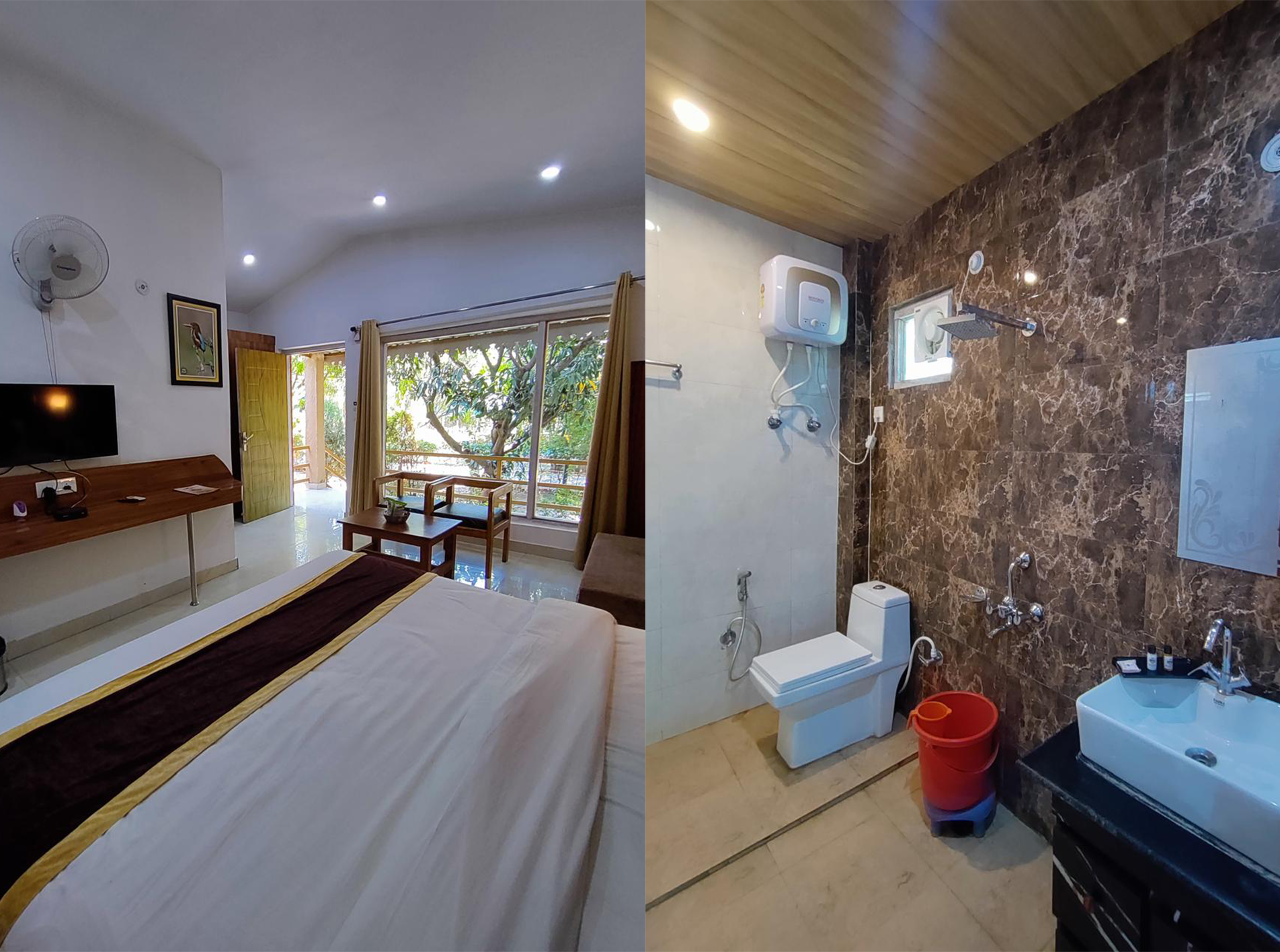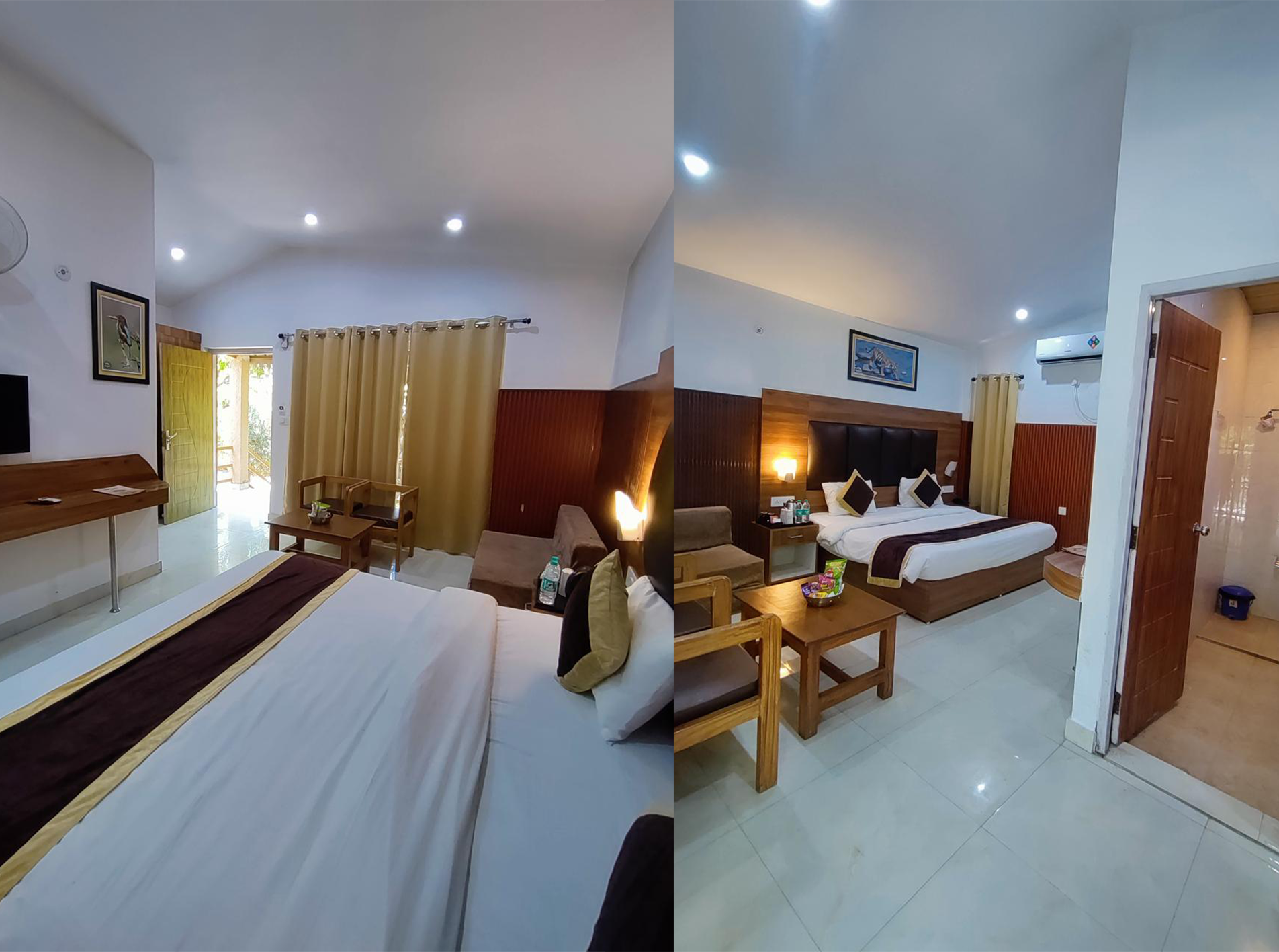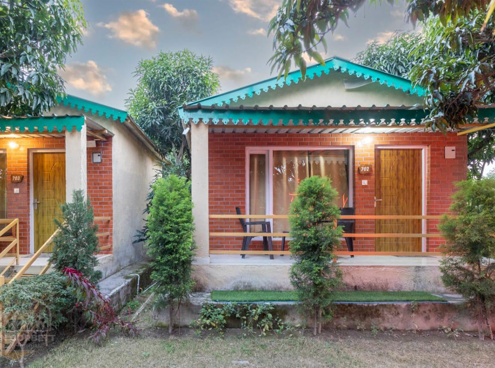 Our Cottages are open out to grand garden space, which offers a panoramic view situated in between the majestic mountains, the placid Ramganga River, and the verdant, blossoming gardens. The rooms are attached with have a separate dressing area and a big washroom with an enclosed shower partition.