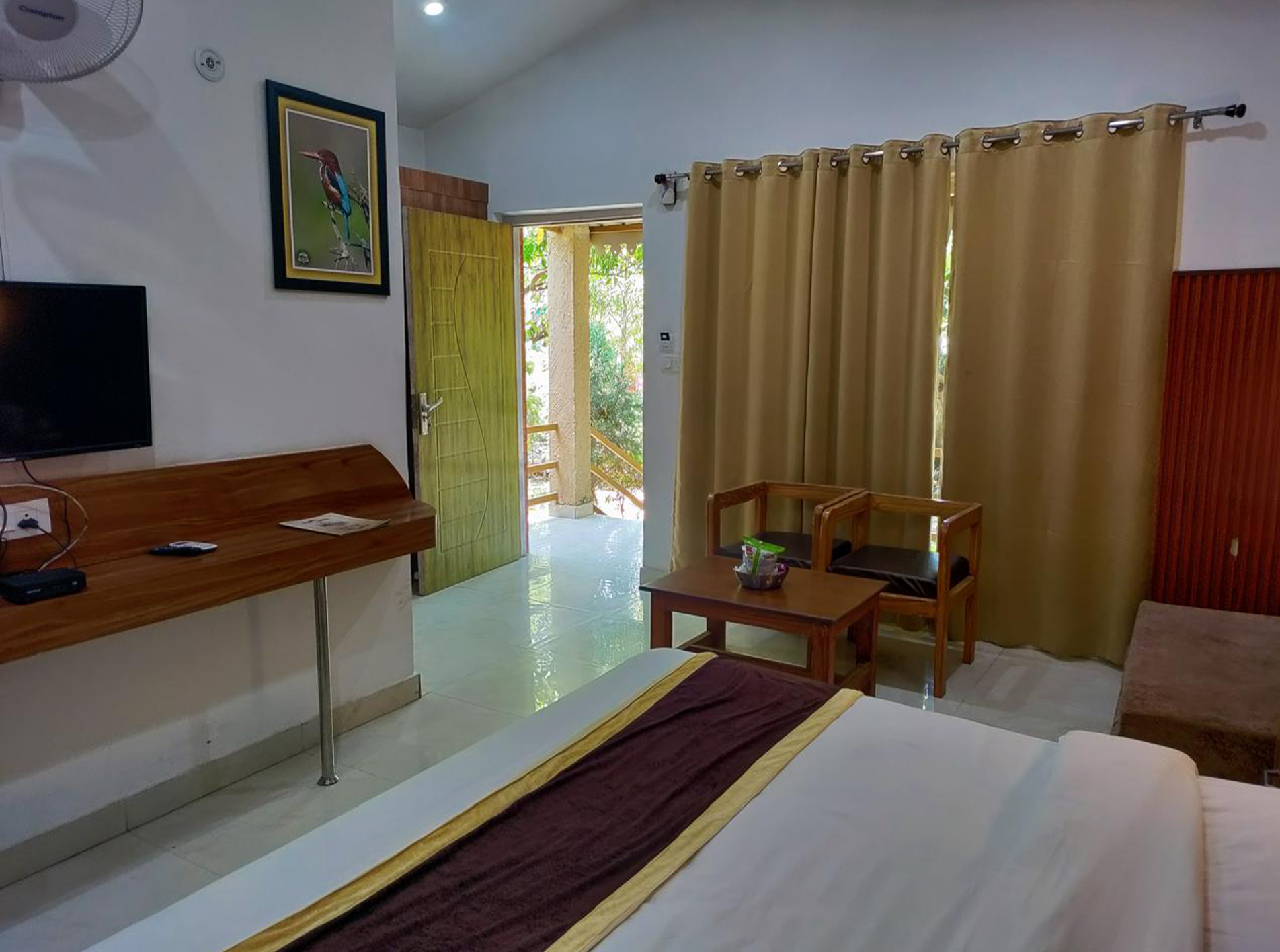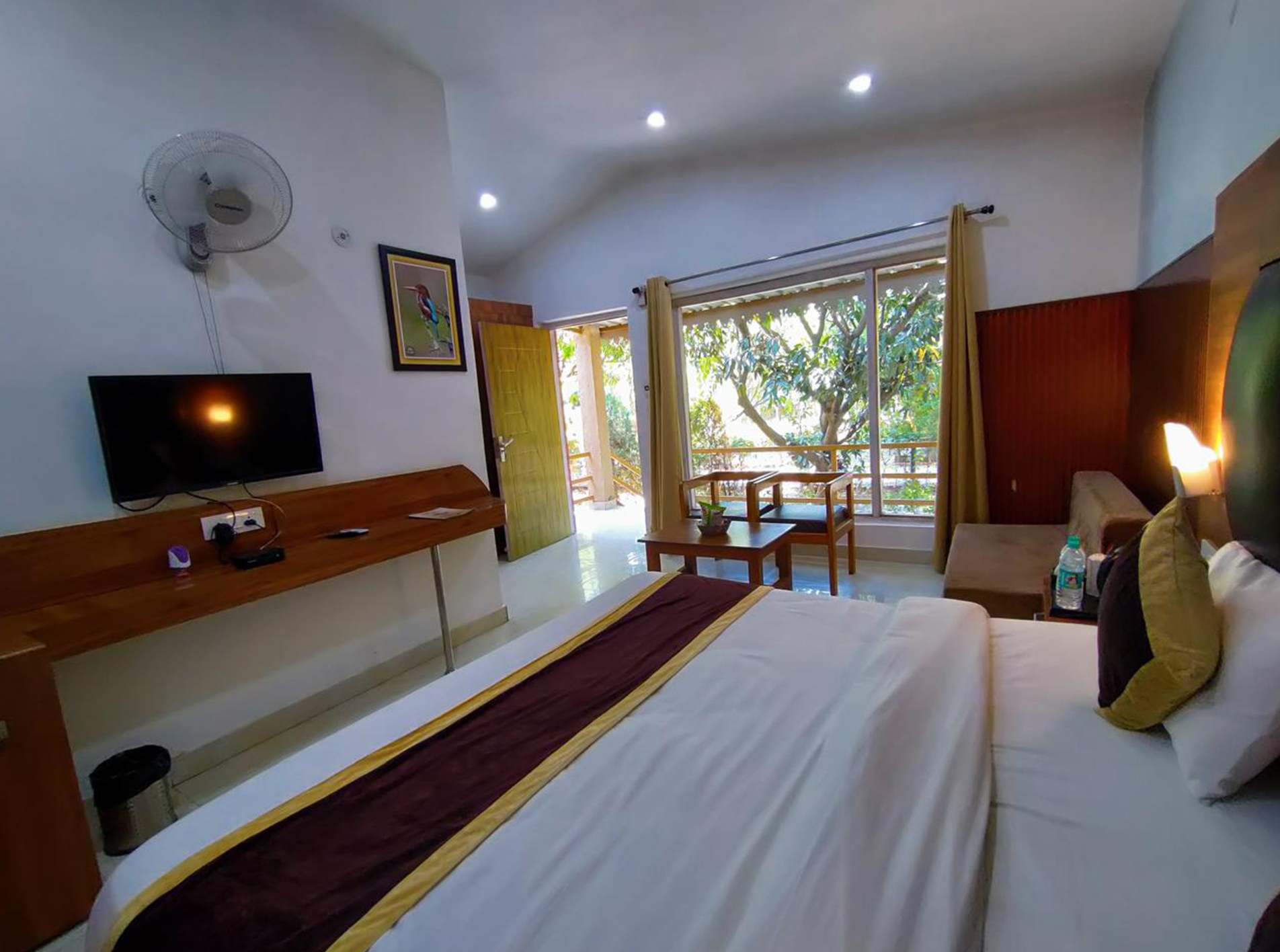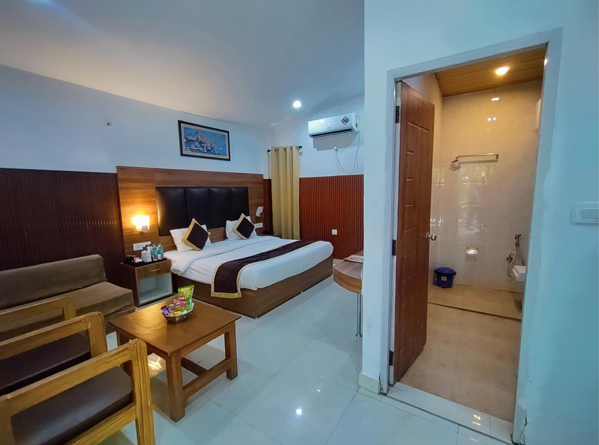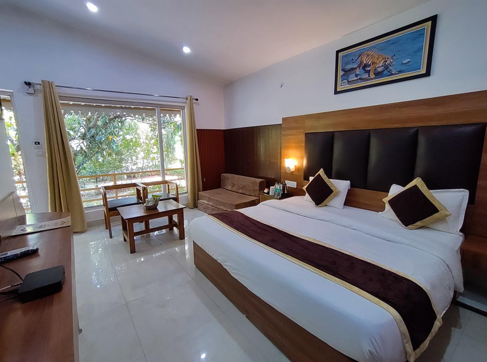 Our Cottages are open out to grand garden space, which offers a panoramic view situated in between the majestic mountains, the placid Ramganga River, and the verdant, blossoming gardens. The rooms are attached with have a separate dressing area and a big washroom with an enclosed shower partition.